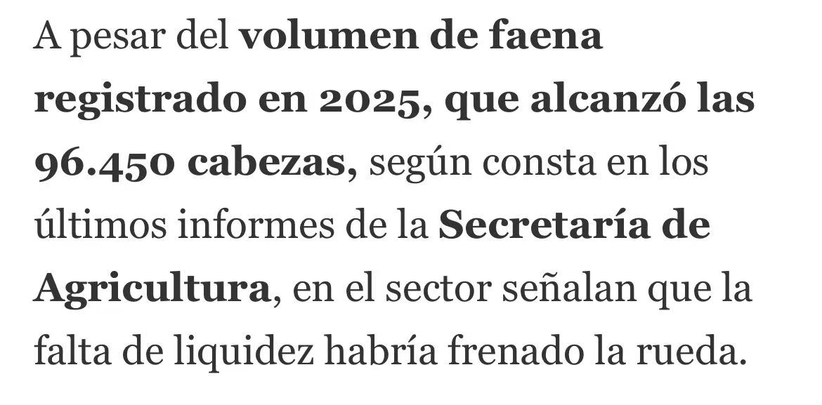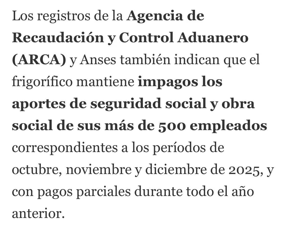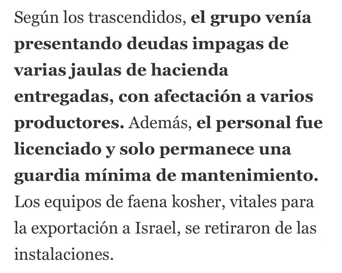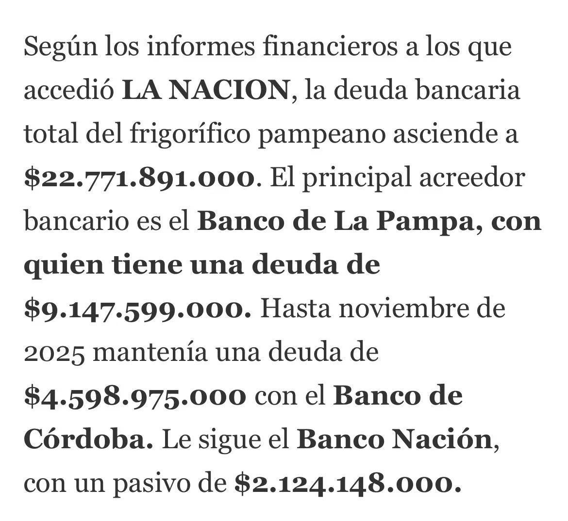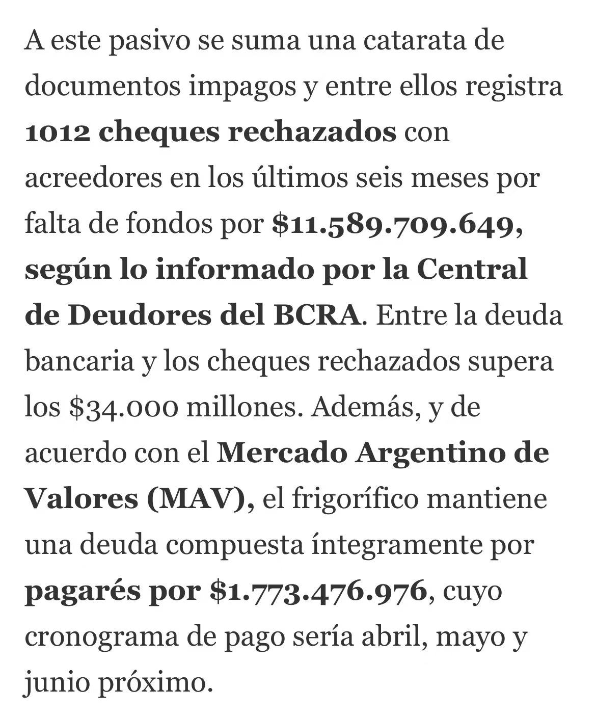 该企业在拉潘帕省拥有 General Pico(2531 厂)和 Trenel(2792 厂) 两家工厂,此前日屠宰量可达 600 头。财务报告显示,其银行债务达 227.7 亿比索,主要债权方包括拉潘帕银行、科尔多瓦银行及阿根廷国家银行。此外,企业在过去半年内有 1012 张支票因资金不足遭退票,金额约 115.9 亿比索,同时还有 ANSES 社保欠款及对养殖商的未结货款。