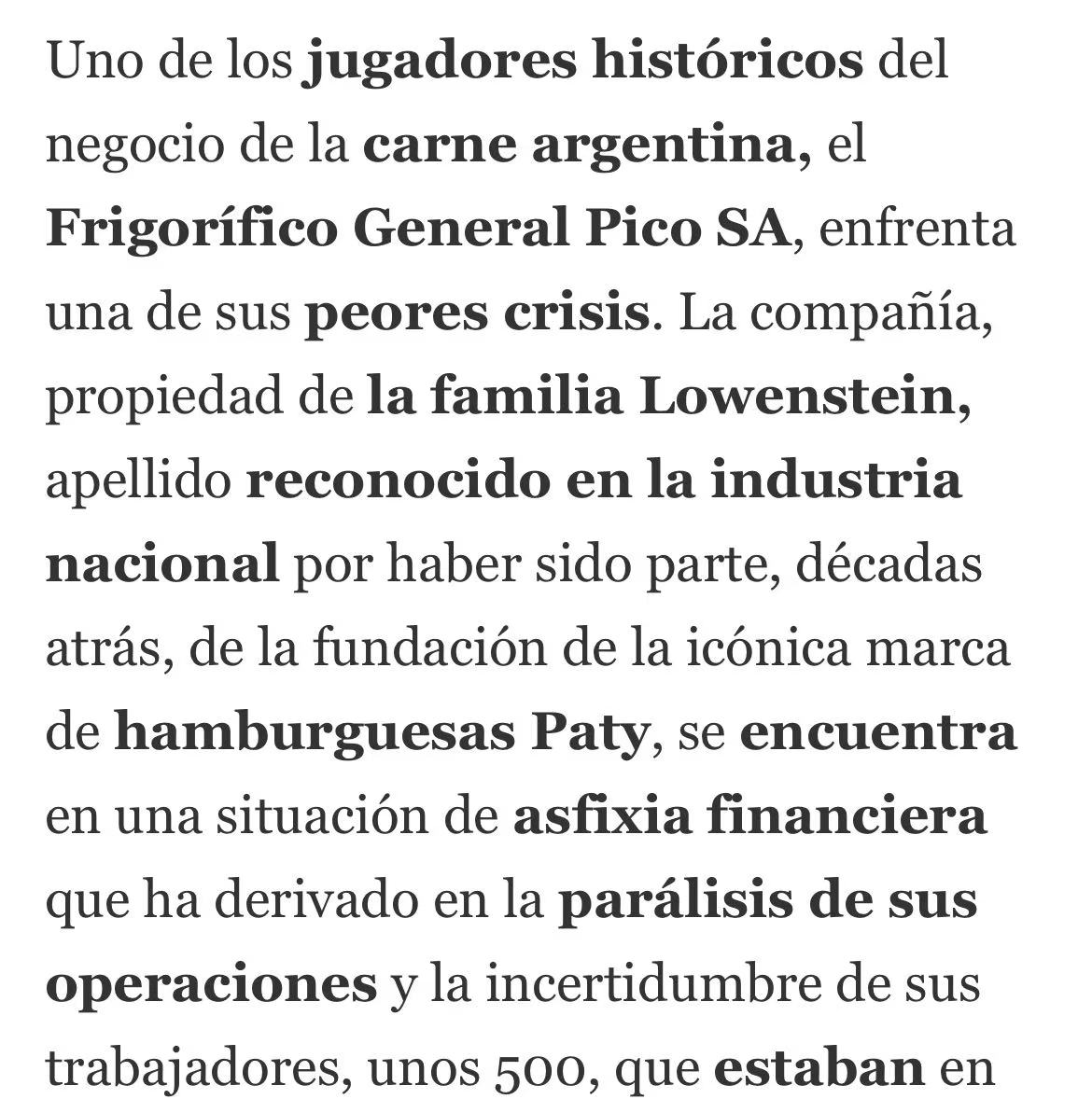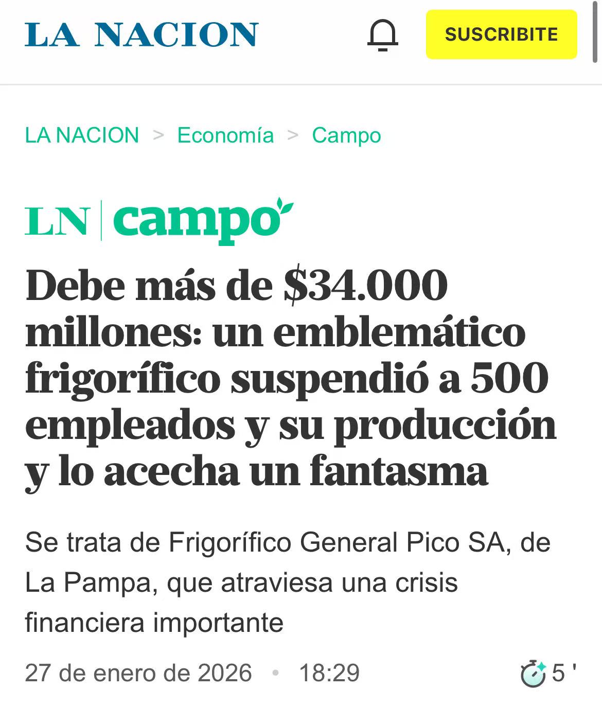 阿根廷老牌肉类加工企业 Frigorífico General Pico SA 陷入严重财务危机。该公司目前负债总额已超过 340 亿比索,生产基本停滞,约 500 名员工被迫休假,薪资与社保均遭拖欠。