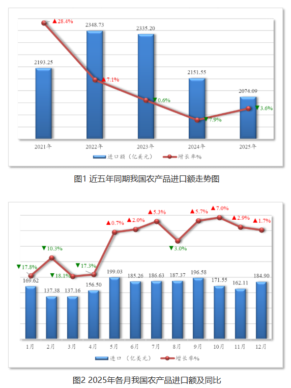 据海关统计,2025年1-12月,我国农产品进口总额2,074.1亿美元,比上年同期下降3.6%,占全国外贸进口总额8%,农产品进口整体呈现收缩态势。