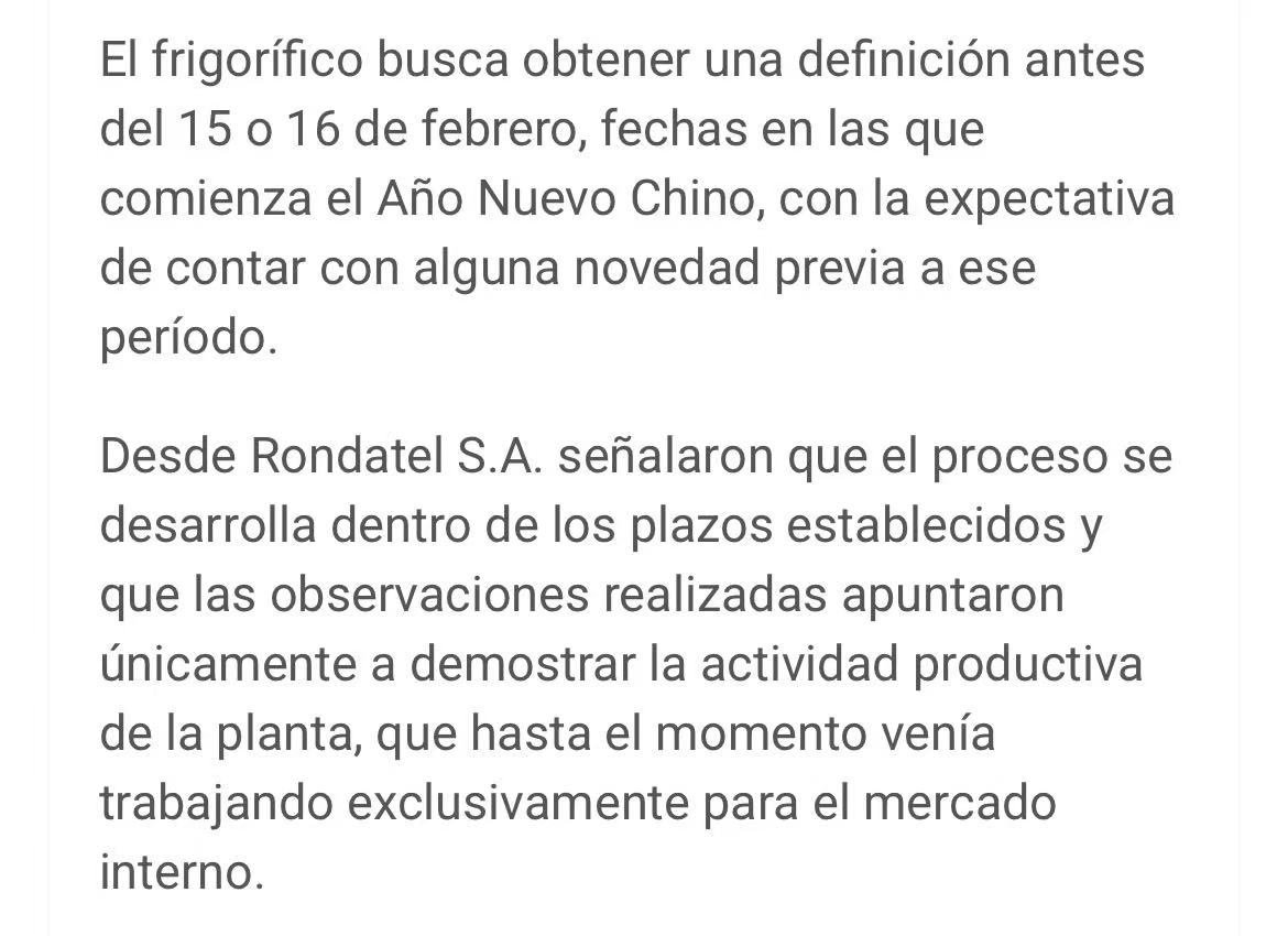 乌拉圭肉类加工企业Frigorífico Rosario(Rondatel S.A.)——22厂,正加紧推进对华出口准入程序,已按中方要求补充提交相关文件及生产样品,以期在农历新年前获准向中国出口牛肉。
