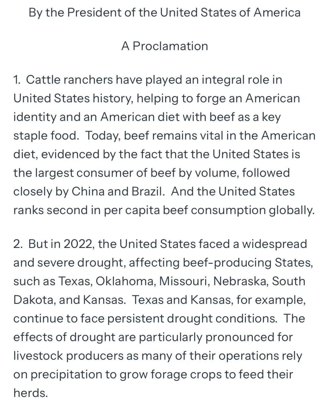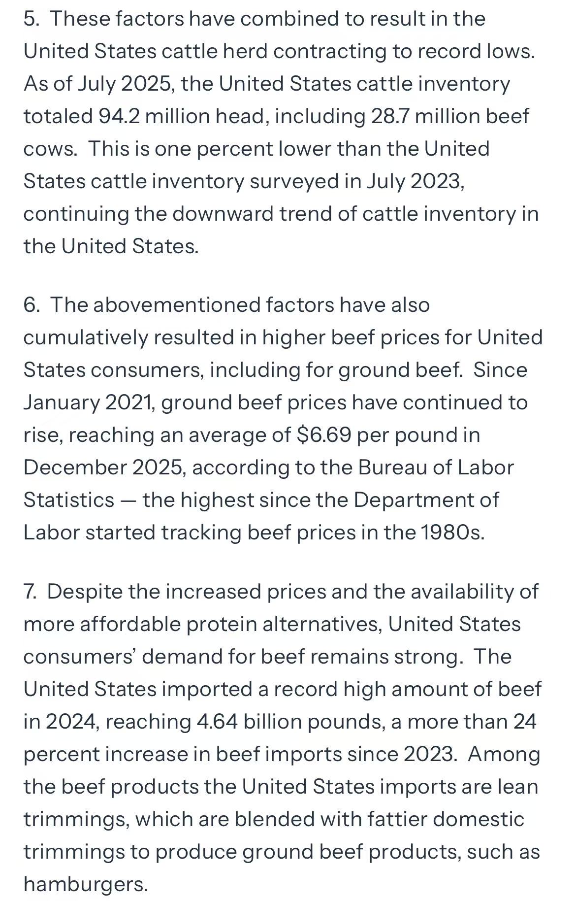 该决定基于美国当前畜牧业的现实困境。近年来持续干旱、野火等自然灾害导致多州牧场受损,牛群存栏量降至历史低位。同时,国内碎牛肉价格已攀升至数十年来的高点。为保障市场供应、稳定肉类价格,美国政府决定临时增加进口配额。