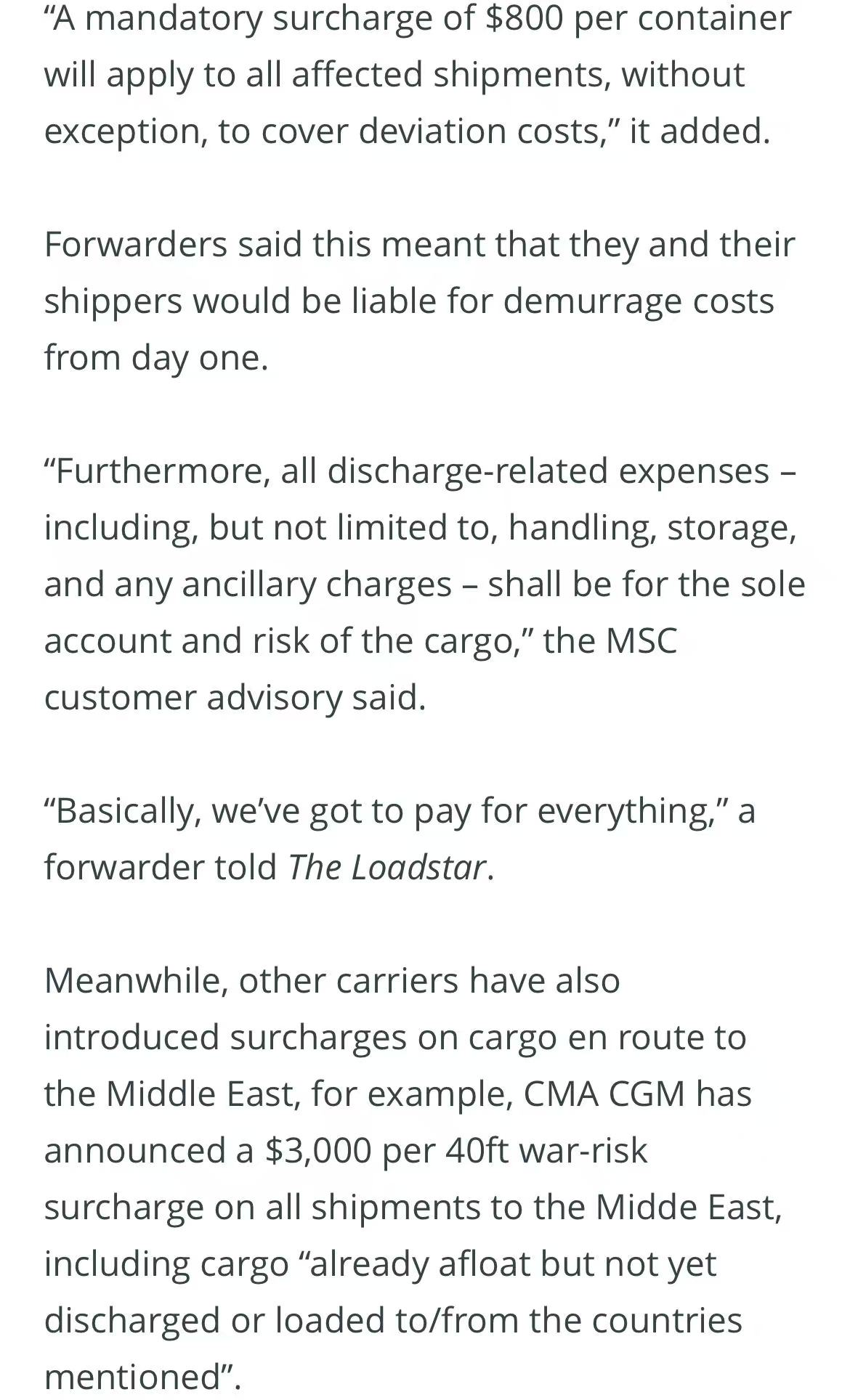 更关键的是,MSC宣布启动提单第13条条款,对所有在途及已抵港的目的地为波斯湾港口的货物,执行“航程终止”。这意味着,船公司有权在任何安全港口卸下货物,后续提货、转运及所有相关费用(装卸费、仓储费等)全部由货主承担。