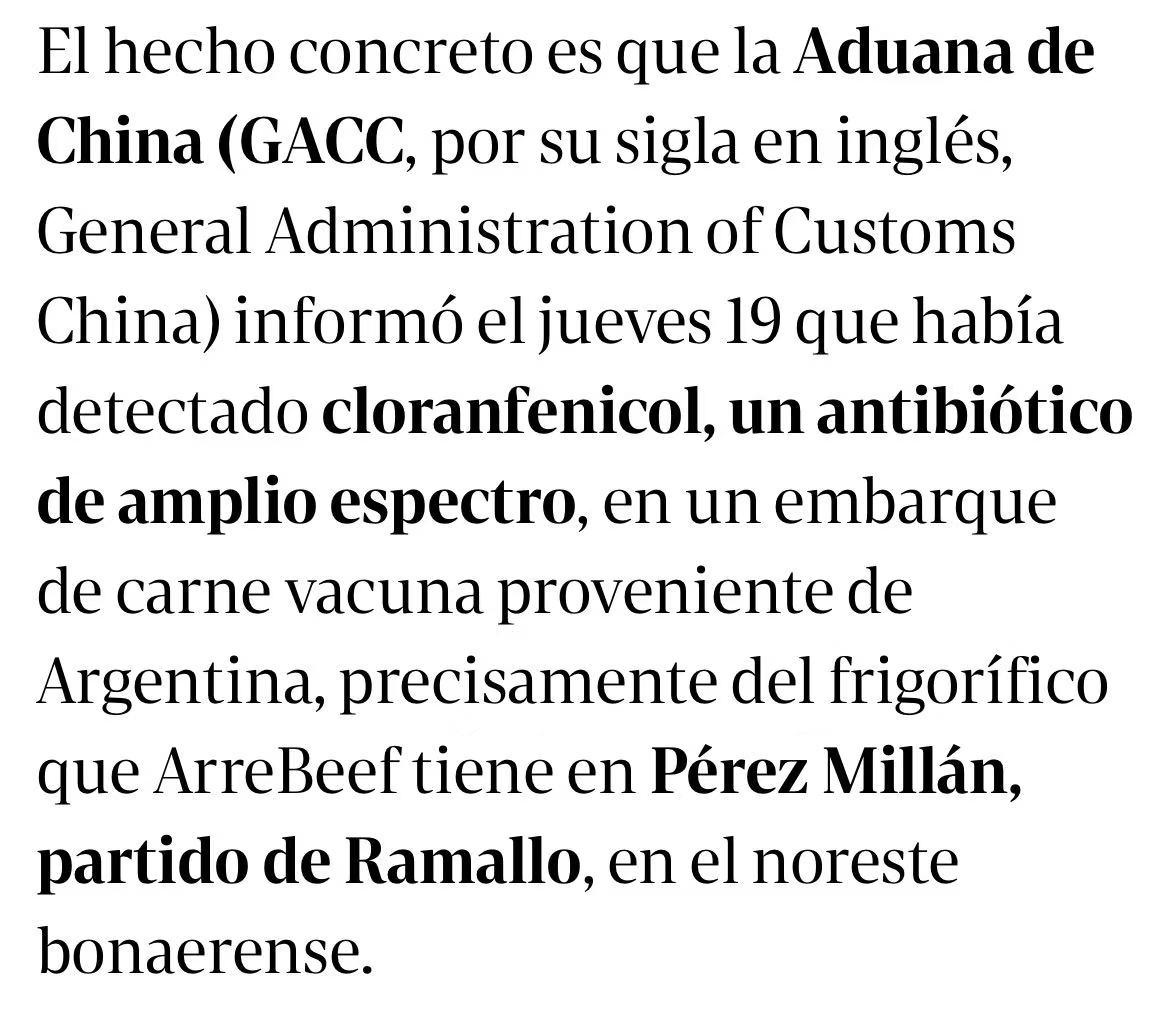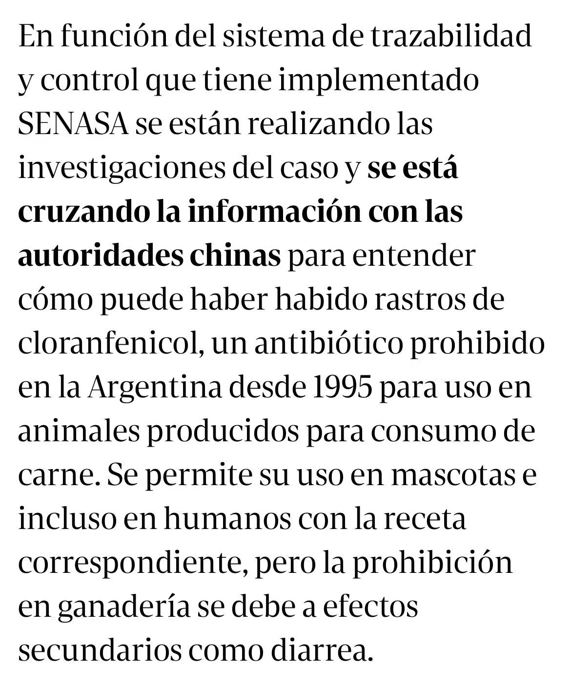 氯霉素是一种广谱抗生素,自1995年起阿根廷已禁止用于食用动物养殖。目前,阿根廷国家农业食品质量卫生局(SENASA)已联合外交部、农业部启动调查,并与中方进行信息核对,以查明残留原因。