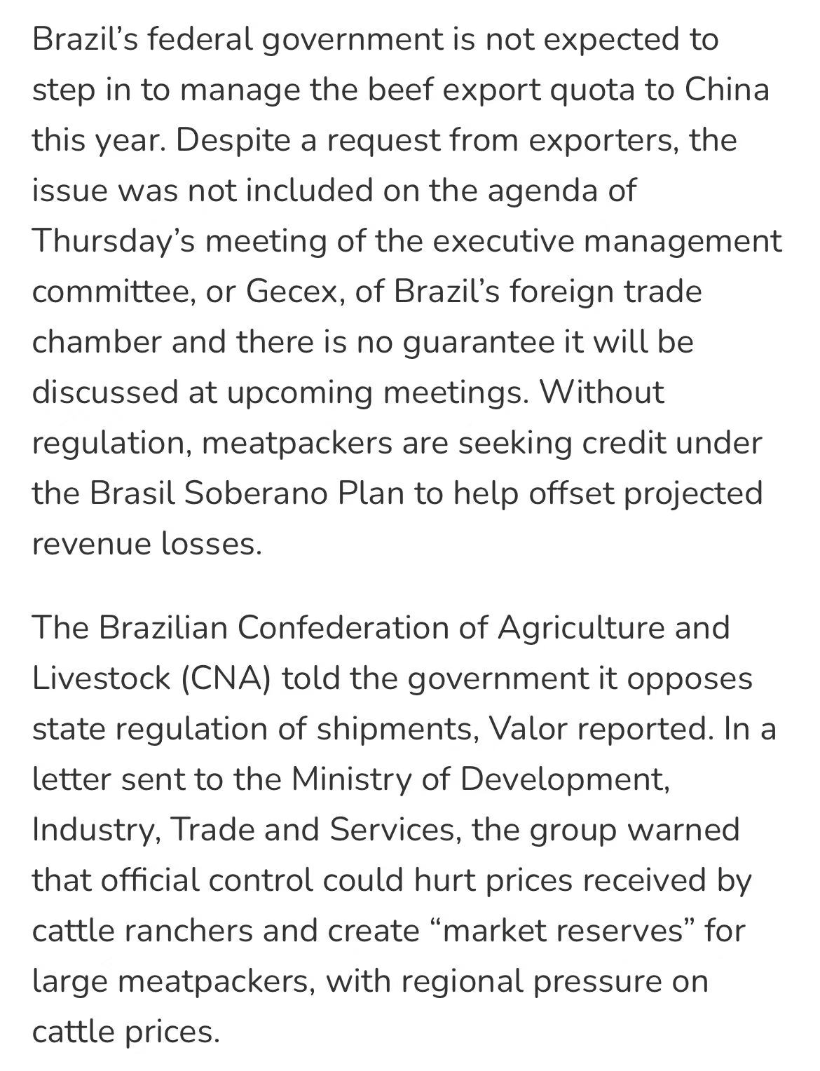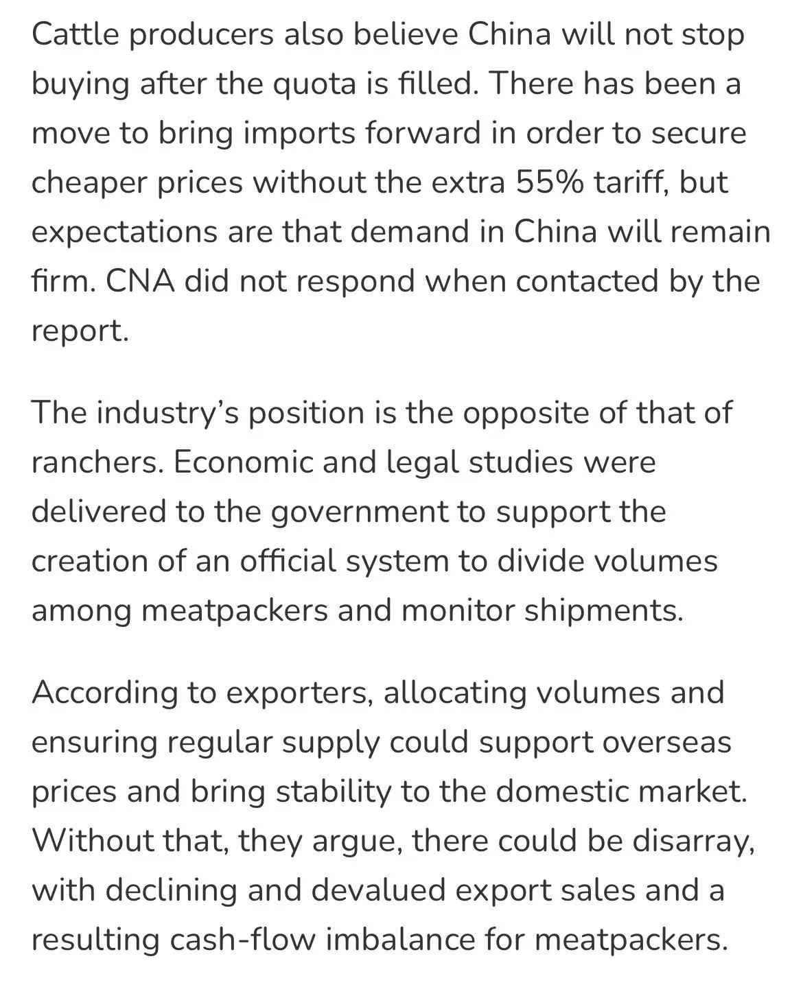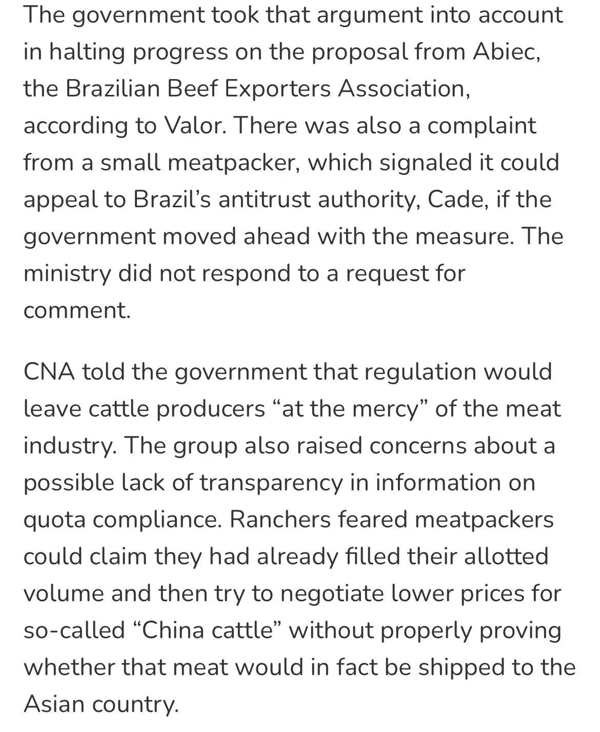 巴西农牧业联合会(CNA)明确反对官方干预,理由有二:一是担心政府管控会压低牧场主获得的牛价;二是担忧屠宰企业以“配额已满”为由压价收购,而牧场主无法核实货物是否真正输华。此外,一家小型屠宰厂甚至威胁,若政府推进配额分配,将向反垄断机构提出申诉。