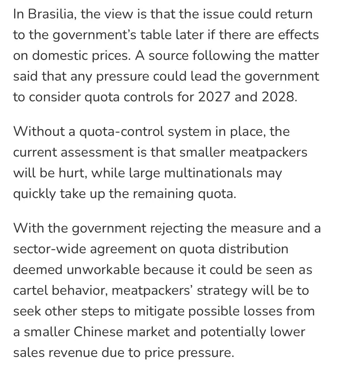 第一,配额消耗速度不会放缓。1-2月已用掉三分之一,若无官方管控,出口商大概率会继续“抢跑”,配额可能在年中或更早耗尽。这意味着下半年巴西牛肉到岸价可能因加征55%关税而大幅上涨。