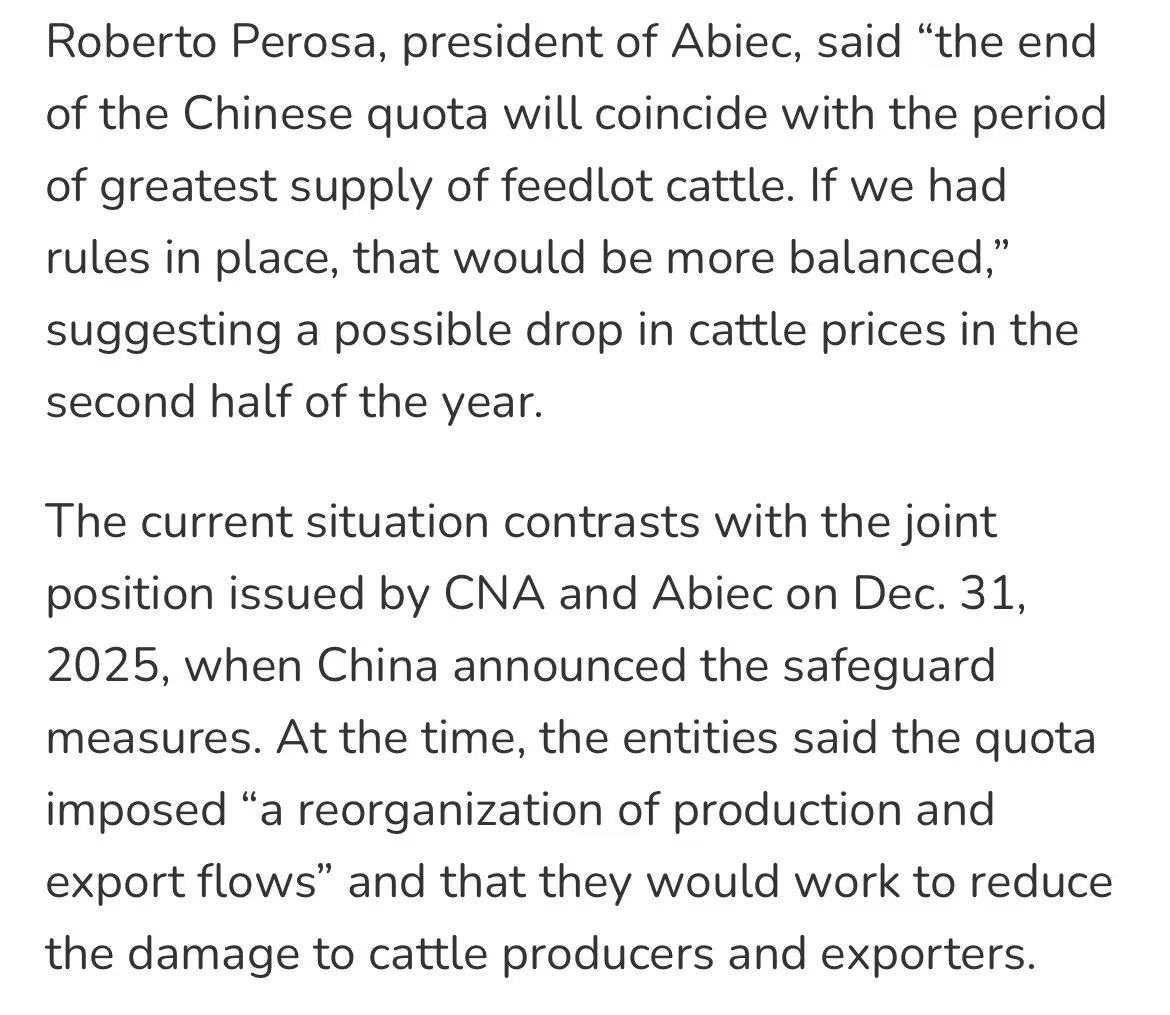 与之相反,巴西肉类出口工业协会(Abiec)主张建立官方分配体系,认为有序分配有助于稳定国际价格,避免“无序竞争”导致出口价格下滑、企业现金流承压。Abiec主席警告,中国配额耗尽的时间节点恰好与育肥牛出栏高峰期重叠,若无管控,下半年牛价可能出现明显回落。