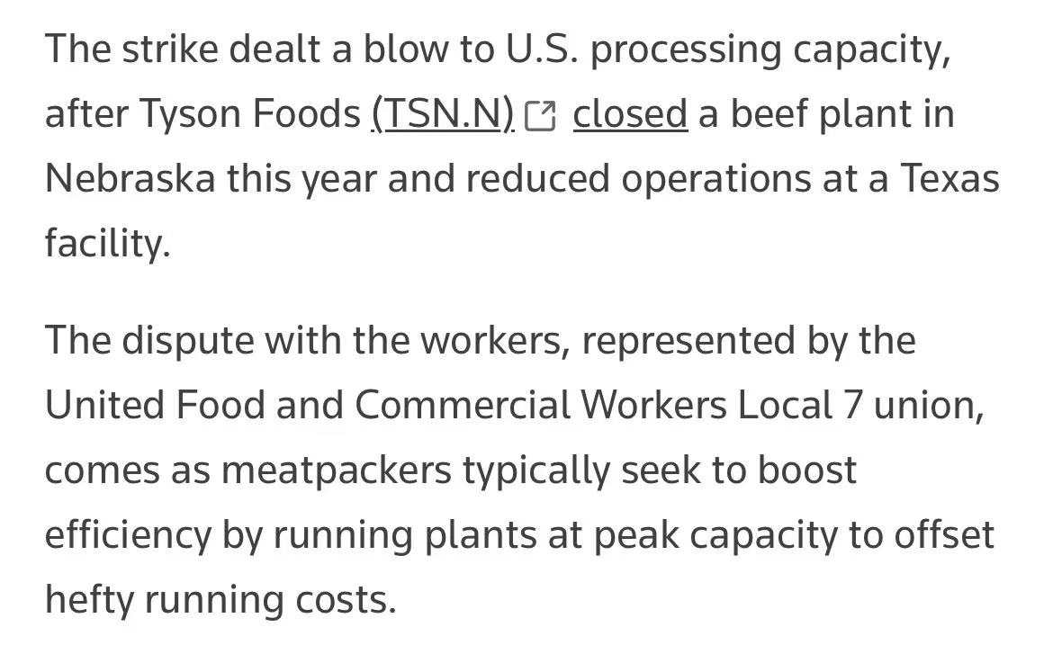 若谈判破裂,罢工随时可能重来,美国牛肉供应将再遭“断腕”,价格或进一步冲高。
