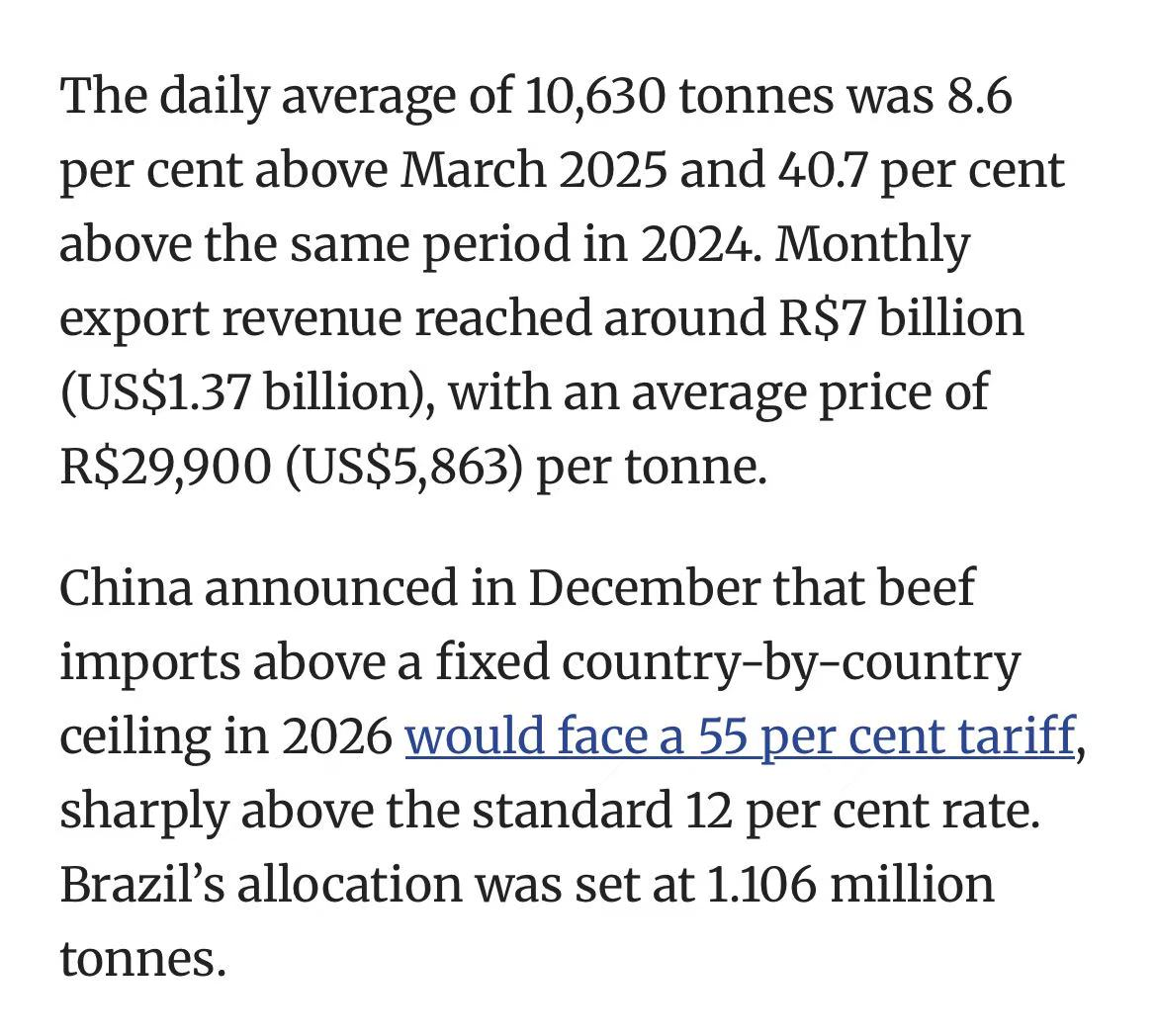 中国自今年起对超配额牛肉加征55%关税。巴西去年对华牛肉出口占其总量的46%,冲击巨大。
