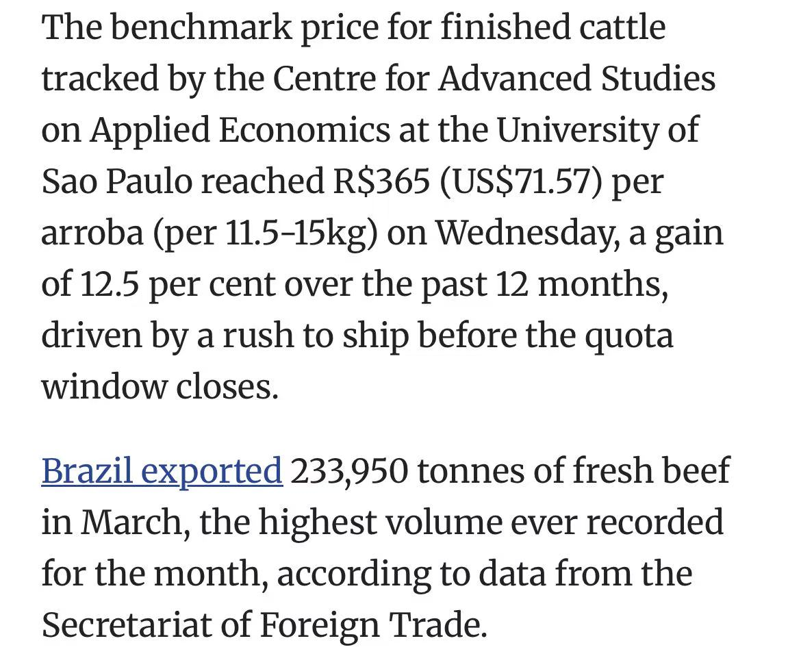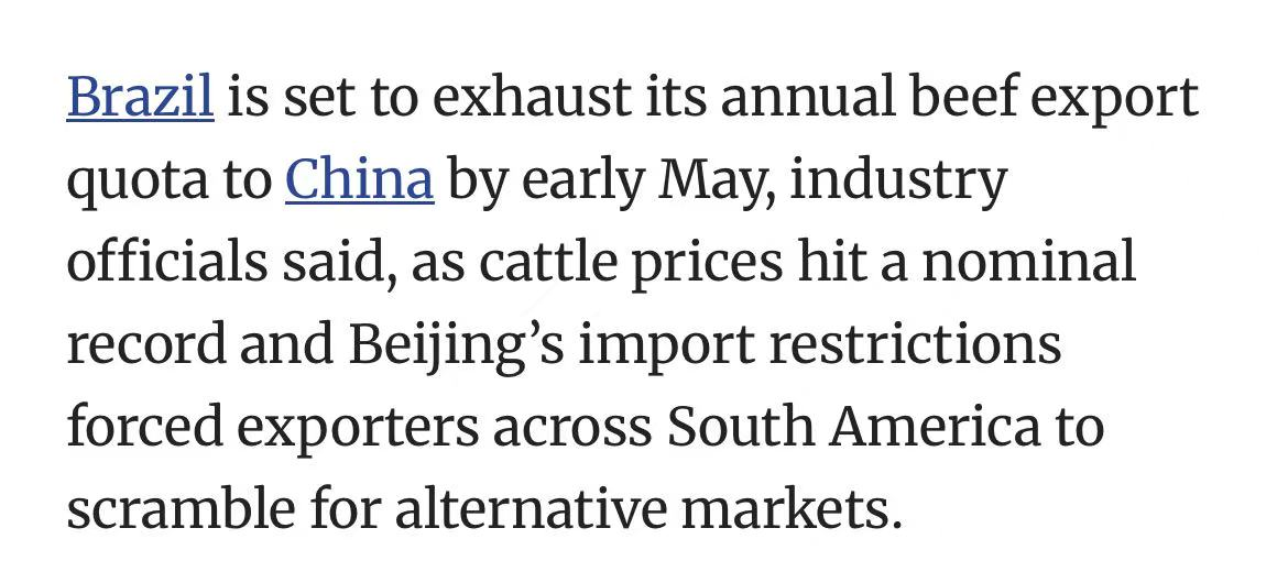 疯狂抢运!巴西牛肉配额5月耗尽,活牛价格已飙至历史最高