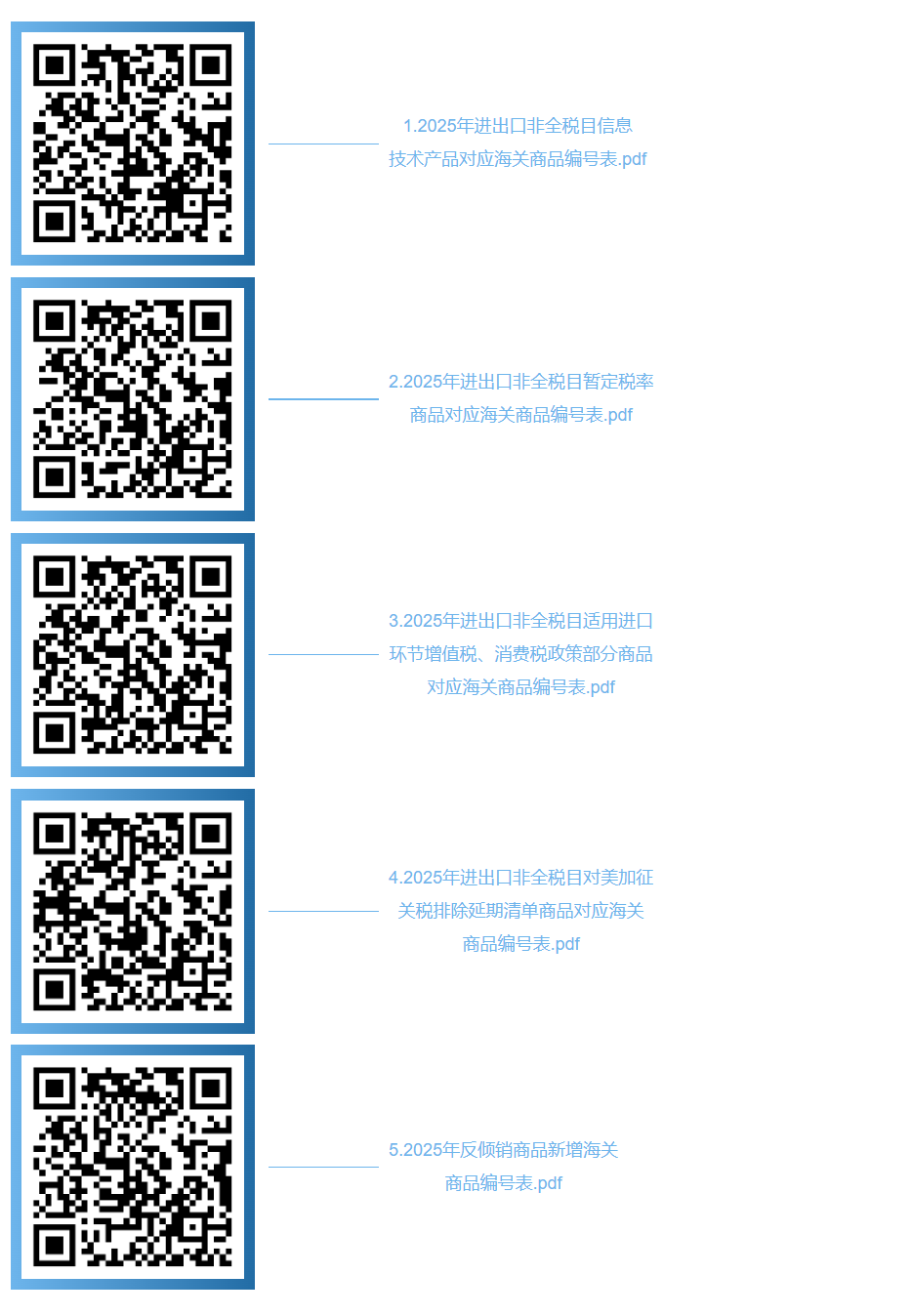 为有效实施2025年信息技术产品最惠国税率、进出口商品暂定税率、抗癌药品和罕见病药品等进口环节增值税政策、部分油品等进口环节消费税政策、对美加征关税商品排除延期清单和反倾销措施等,海关总署为非全税目适用进出口环节税收政策的商品拆分了10位海关商品编号,并编制了《2025年进出口非全税目信息技术产品对应海关商品编号表》《2025年进出口非全税目暂定税率商品对应海关商品编号表》《2025年进出口非全税目适用进口环节增值税、消费税政策部分商品对应海关商品编号表》《2025年进出口非全税目对美加征关税排除延期清单商品对应海关商品编号表》《2025年反倾销商品新增海关商品编号表》(见附件1—5)。