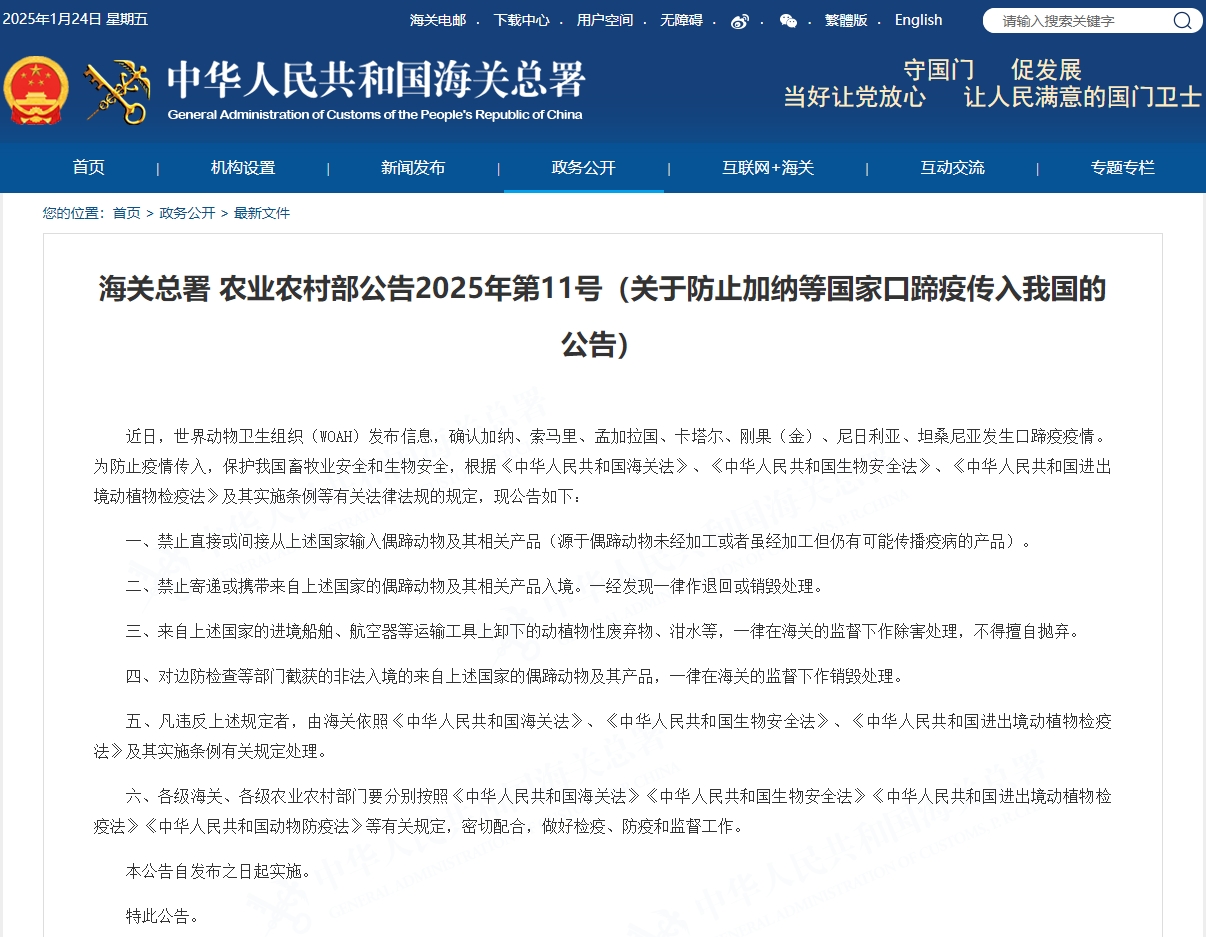 普悦 ·资讯 | 海关总署农业农村部公告2025年第11号(关于防止加纳等国家口蹄疫传入我国的公告)