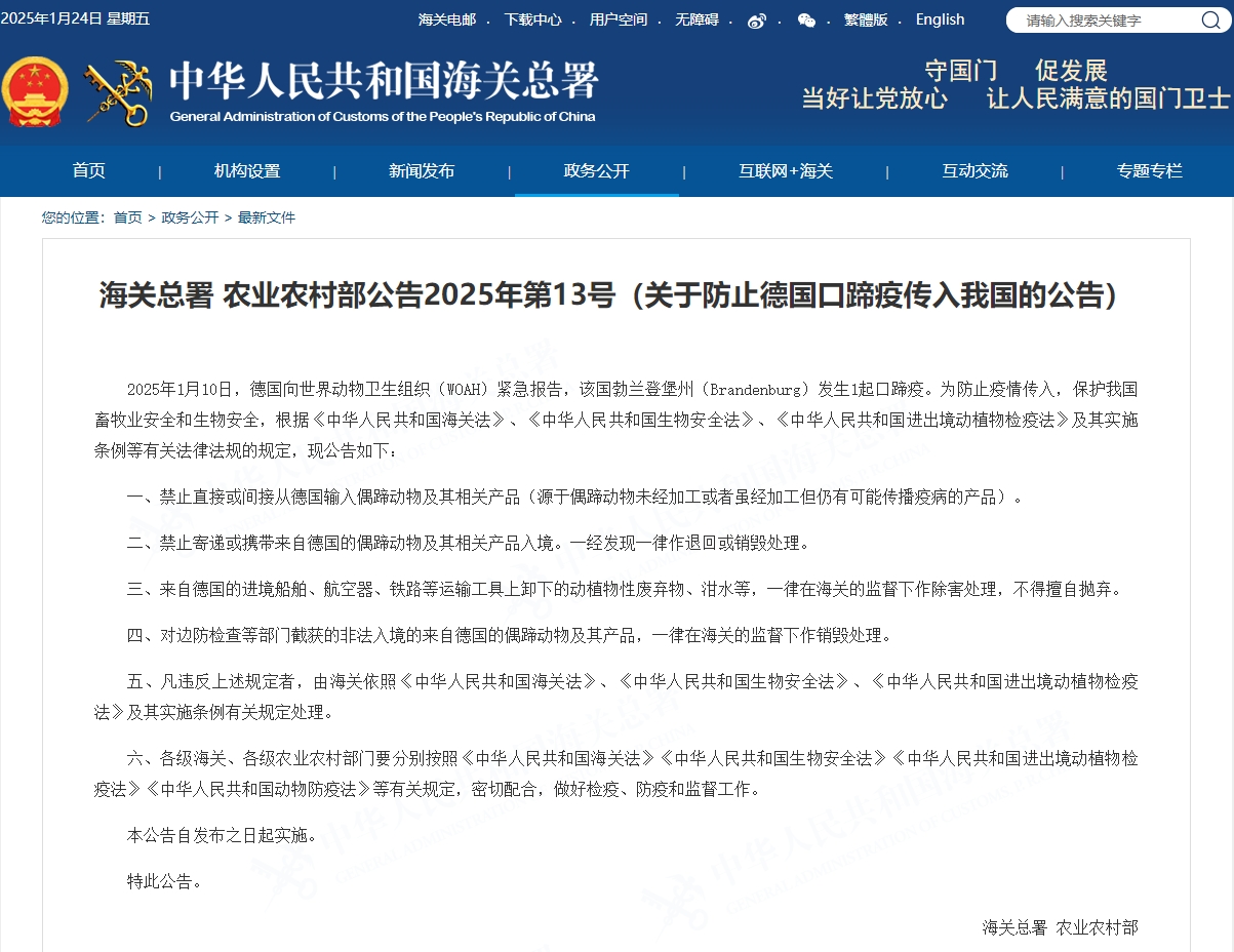 普悦 ·资讯 | 海关总署农业农村部公告2025年第13号(关于防止德国口蹄疫传入我国的公告)