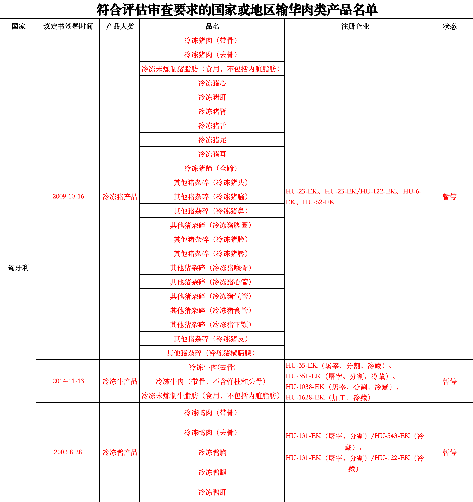 近日,海关总署更新《符合评估审查要求的国家或地区输华肉类产品名单》: