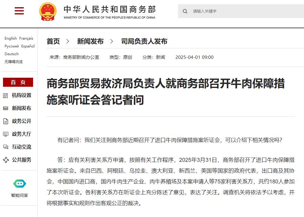 4月1日,商务部网站发表声明称,商务部贸易救济局负责人表示,应有关利害关系方申请,按照有关工作程序,2025年3月31日,商务部召开了进口牛肉保障措施案听证会。