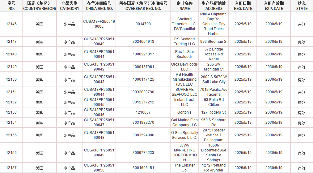 普悦 ·资讯 | 【准入更新】海关5月19日更新美国12家水产品企业输华注册