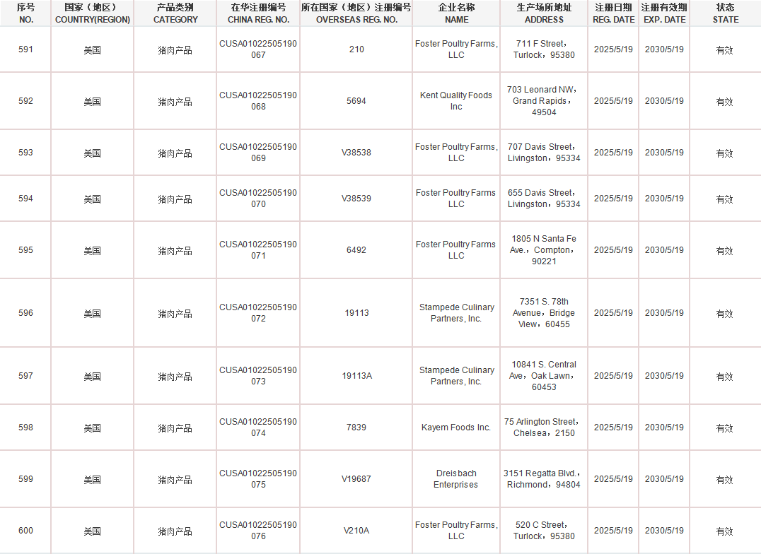 新增美国10家猪肉企业,注册编号为:210、5694、V38538、V38539、6492、19113、19113A、7839、V19687、V210A自2025年5月19日及之后生产的符合中国要求的猪肉产品输华。