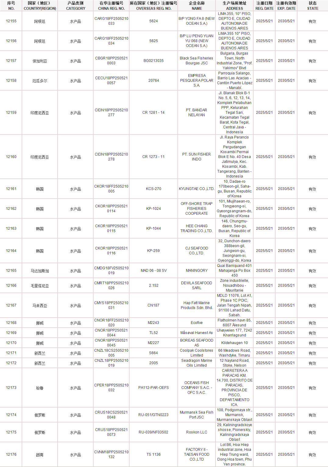 11. 海关总署新增秘鲁1家水产品企业输华注册,(注册编码为:PA112-PAR-OEFS)自2025年5月21日及之后生产的符合中国要求的水产品允许输华。