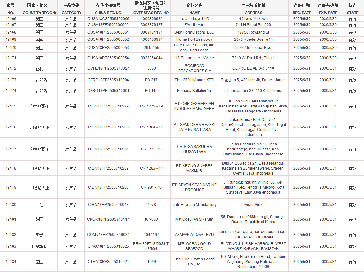 9. 海关总署新增泰国1家水产品企业输华注册,(注册编码为:1099)自2025年5月31日及之后生产的符合中国要求的水产品允许输华。