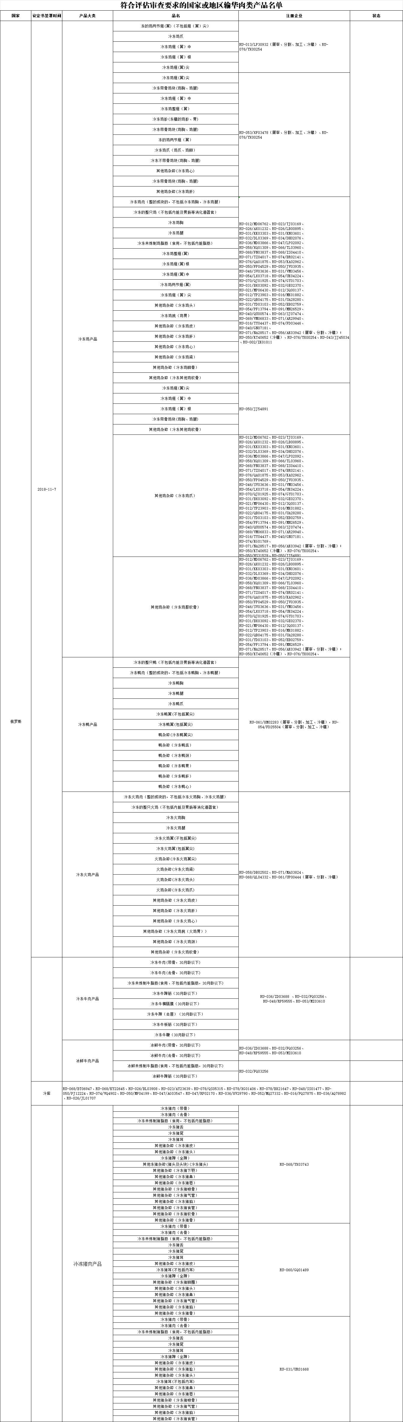 近日,海关总署更新《符合评估审查要求的国家或地区输华肉类产品名单》: