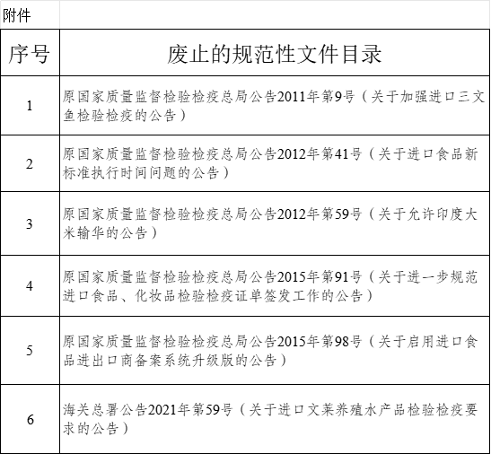 根据工作需要,海关总署决定废止部分进口食品类规范性文件,具体文件目录见附件。本公告自发布之日起生效。