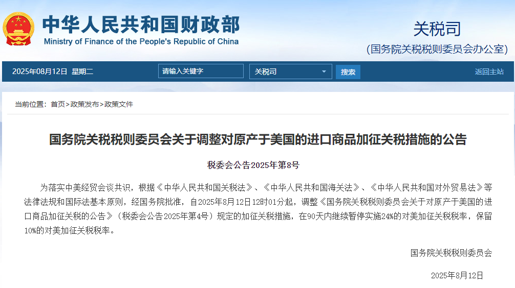 为落实中美经贸会谈共识,根据《中华人民共和国关税法》、《中华人民共和国海关法》、《中华人民共和国对外贸易法》等法律法规和国际法基本原则,经国务院批准,自2025年8月12日12时01分起,调整《国务院关税税则委员会关于对原产于美国的进口商品加征关税的公告》(税委会公告2025年第4号)规定的加征关税措施,在90天内继续暂停实施24%的对美加征关税税率,保留10%的对美加征关税税率。