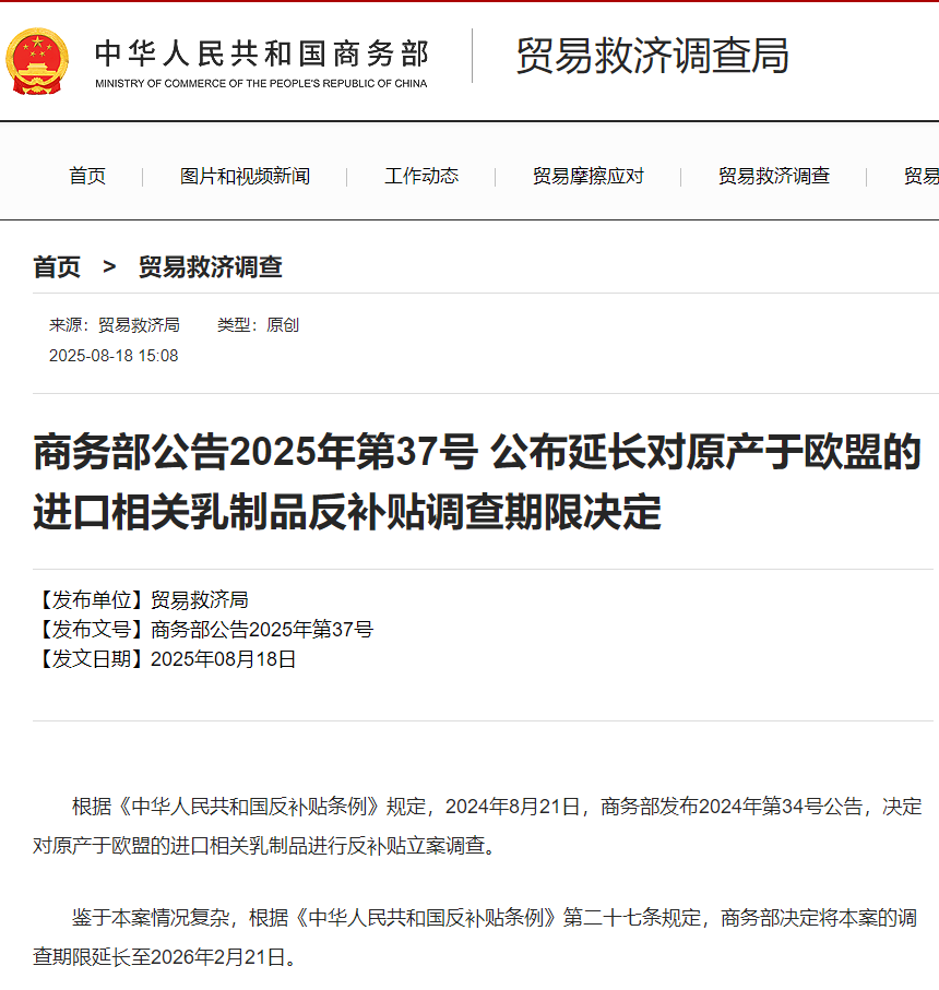 根据《中华人民共和国反补贴条例》规定,2024年8月21日,商务部发布2024年第34号公告,决定对原产于欧盟的进口相关乳制品进行反补贴立案调查。