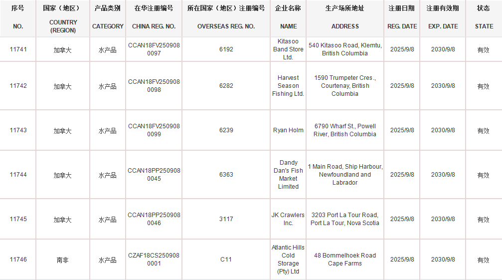 海关总署新增加拿大5家水产品企业输华注册(注册编码为:6192、6282、6239、6363、3117)自2025年9月8日及之后生产的符合中国要求的水产品允许输华。