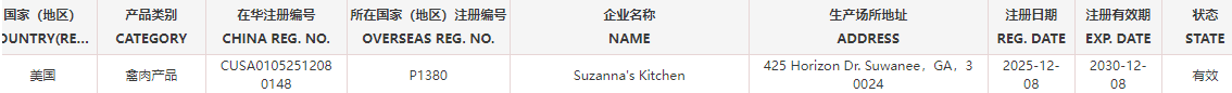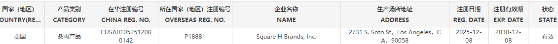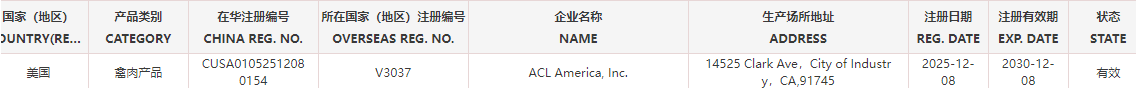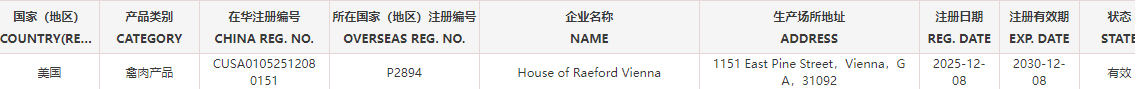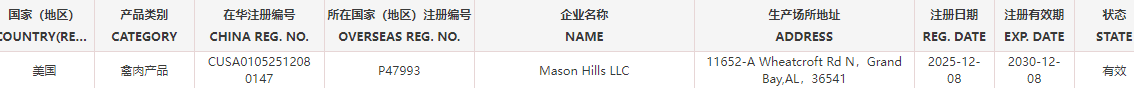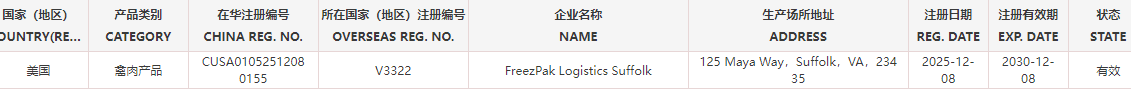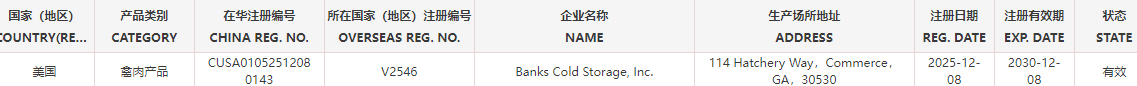 2.新增美国14家禽肉企业(注册编码为:P18881、V3761、P46585、P3474、V2546、V2768、P47993、P1380、V39936、P2894、P31690、V3322、P46255、V3037)自2025年12月8日(含)后生产的输华产品进口准入。