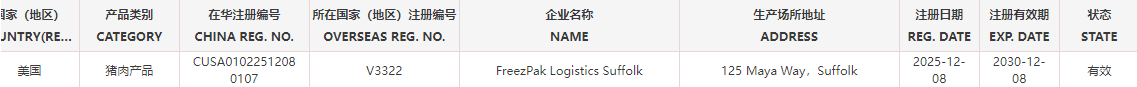1.新增美国7家猪肉企业(注册编码为:V3322、V3037、47993、V3761、V39936、1380、748)自2025年12月8日(含)后生产的输华产品进口准入。