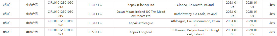 恢复爱尔兰23家牛肉产品(注册编码为:IE 300 EC、IE 344 EC、IE 354 EC、IE 512 EC、IE 351 EC、IE 290 EC、IE 2007 EC、IE 382 EC、IE 292 EC、IE 296 EC、IE 368 EC、EC 033、IE 325 EC、IE 297 EC、IE 350 EC、IE 364 EC、IE 079 EC、IE 2048 EC、IE 378 EC、IE 317 EC、IE 311 EC、IE 313 EC、IE 533 EC)自2026年1月12日(含)后生产的输华产品进口准入。