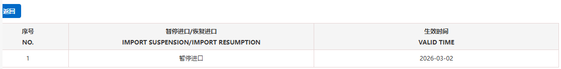 暂停受理美国1家牛肉企业(注册编码为:27300)自2026年3月2日(含)起启运的输华产品进口申报。