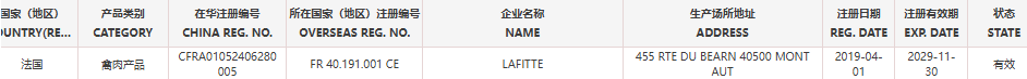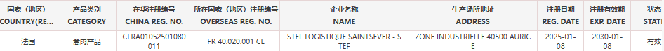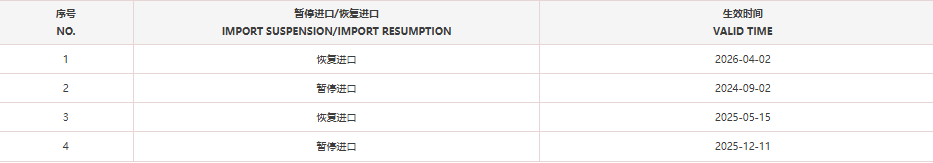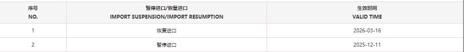 恢复法国2家禽肉产品(注册编码为:FR40.191.001CE、FR40.020.001CE)自2026年3月16日(含)后生产的输华产品进口准入。