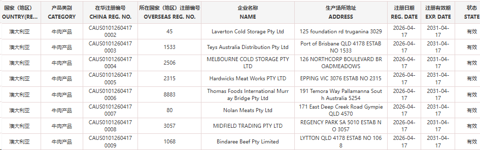 新增澳大利亚8家牛肉企业(注册编码为:45、1533、2506、2315、8883、80、3057、1068)自2026年4月17日(含)后生产的输华产品进口准入。