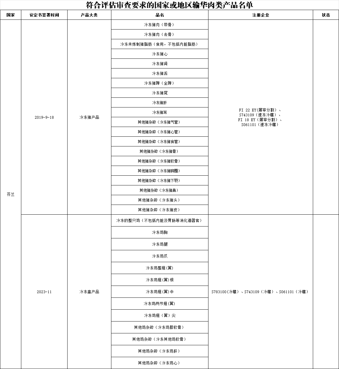 如下图,新增了芬兰冷冻猪产品的部分输华品类: