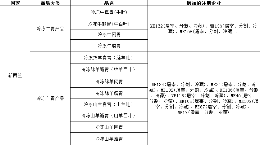 如下图,新增了部分新西兰冷冻牛胃产品和冷冻羊胃产品企业输华: