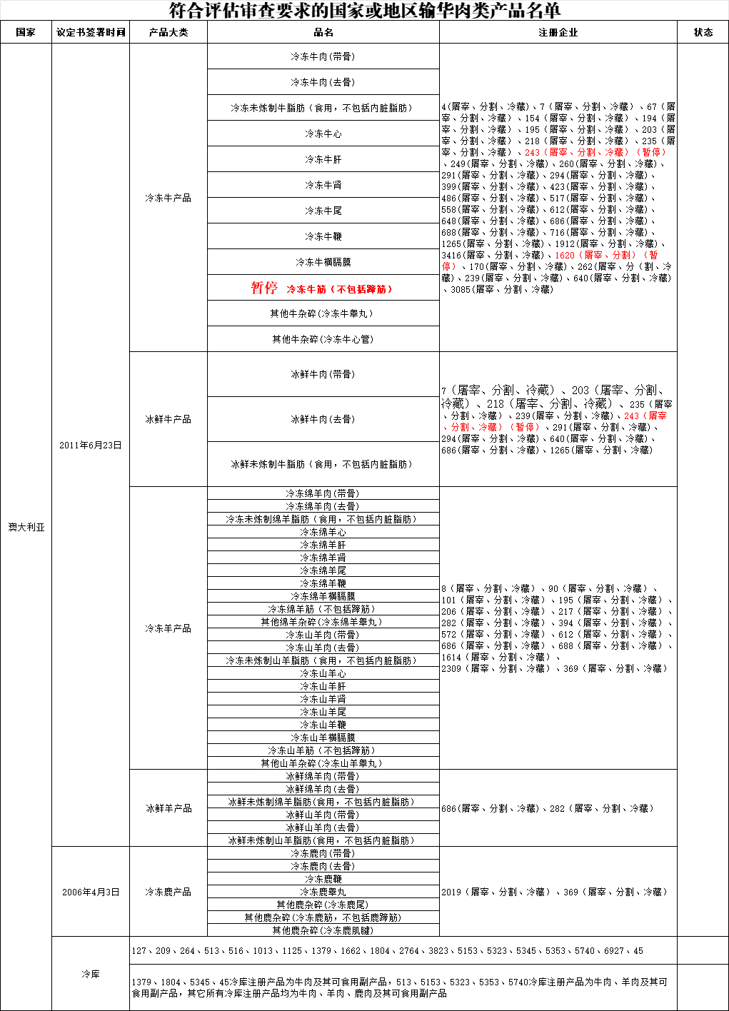近日,海关总署更新《符合评估审查要求的国家或地区输华肉类产品名单》: