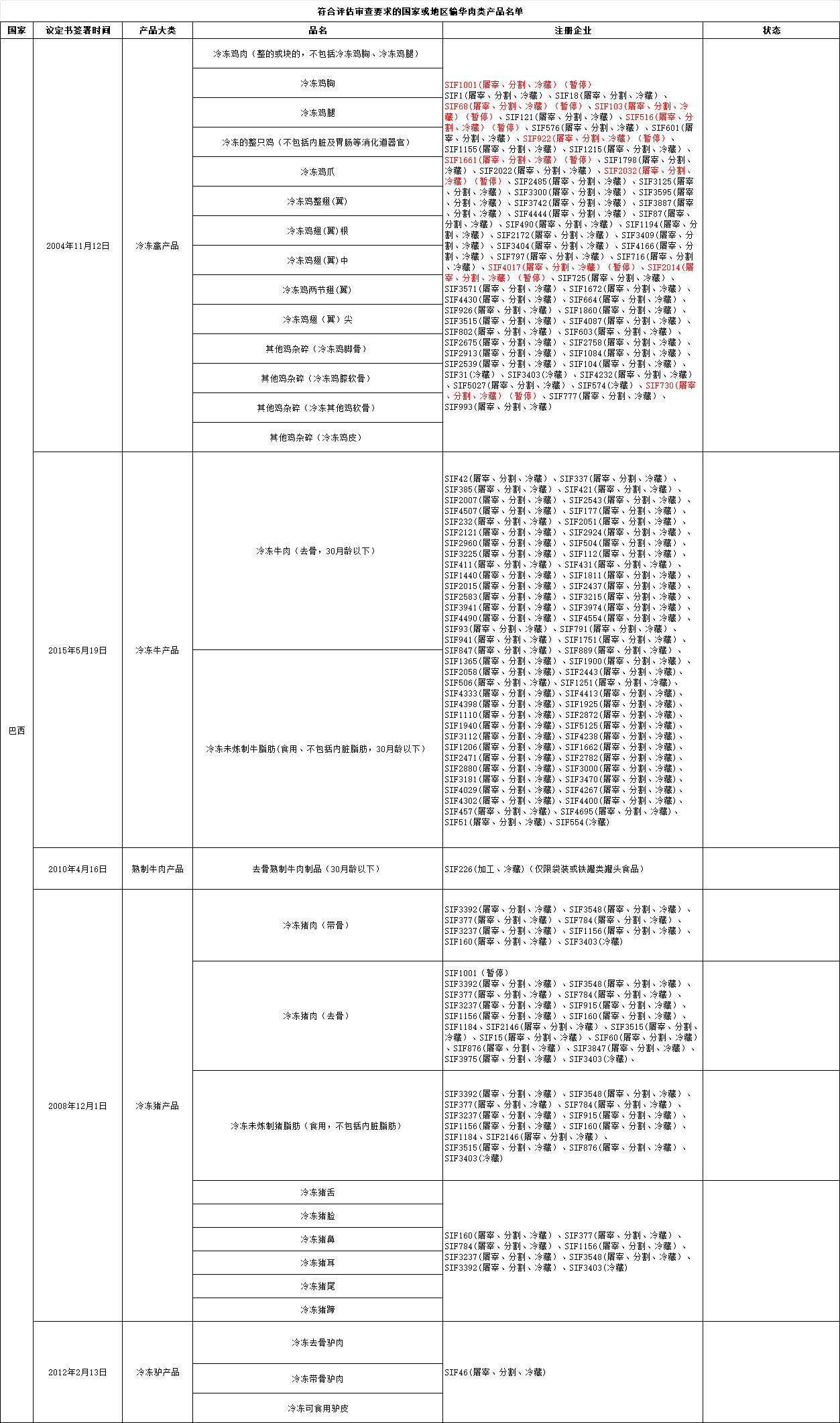 海关发布准入更新: 近日,海关总署更新《符合评估审查要求的国家或地区输华肉类产品名单》: 暂停巴西1家禽肉企业输华: SIF516 暂停法国1家禽肉企业输华: FR 29.026.010 CE 暂停波兰9家禽肉企业输华: 14170501 28620501 30053903 30210501 14023901 12190501 10160501 30051101 28153901