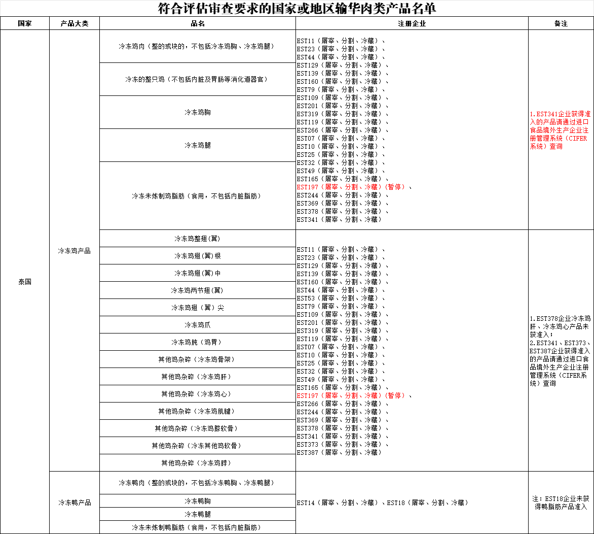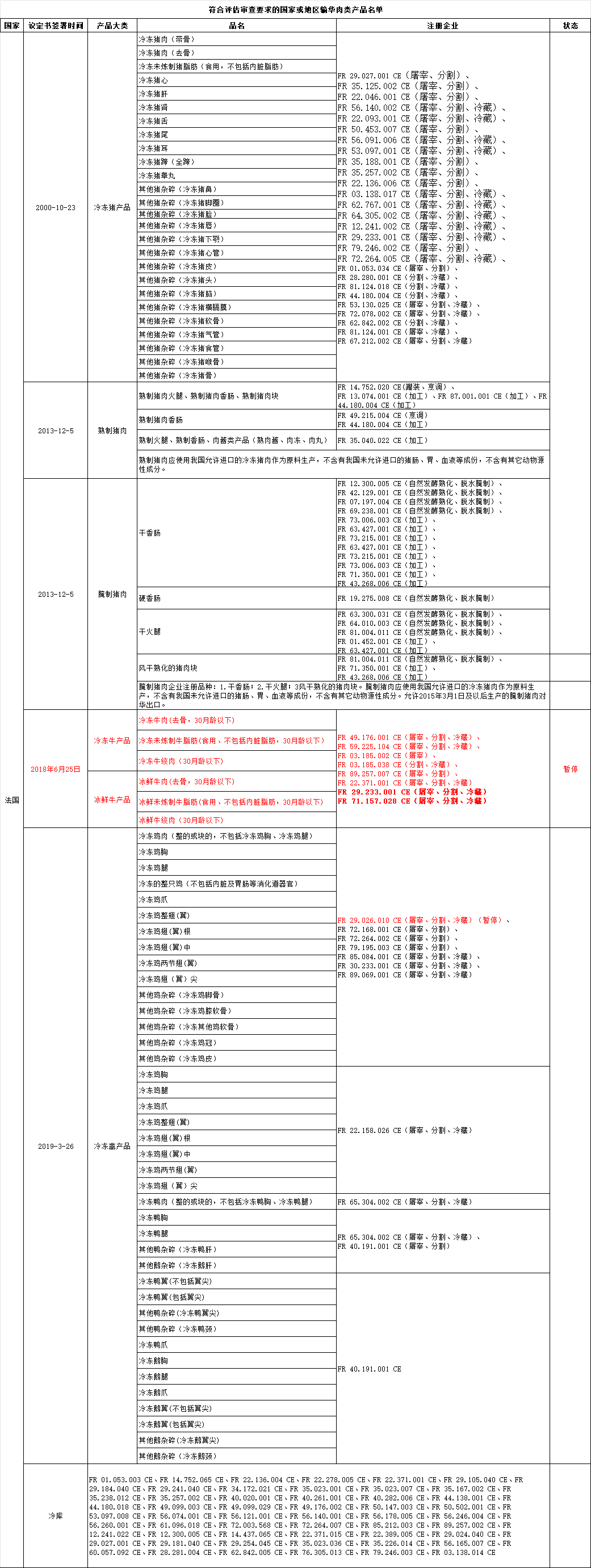 海关发布准入更新: 近日,海关总署更新《符合评估审查要求的国家或地区输华肉类产品名单》: 新增法国1家冷库企业(注册编号为FR 03.138.014 CE)自2024年10月8日及之后贮存的符合中国要求的猪肉产品输华。 新增泰国1家禽肉企业(注册编号为EST.18)自2024年10月8日及之后生产的符合中国要求的禽肉产品输华。