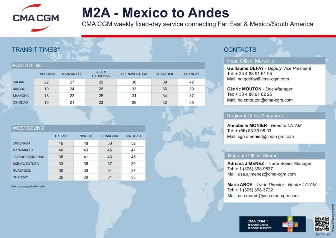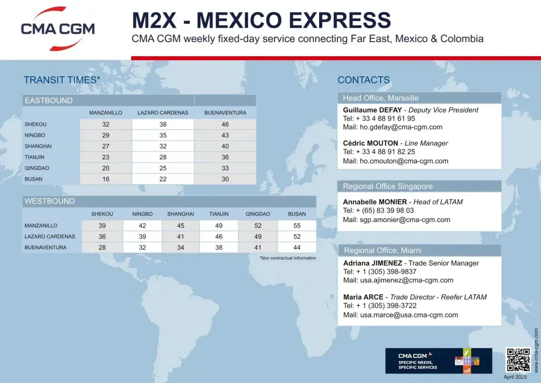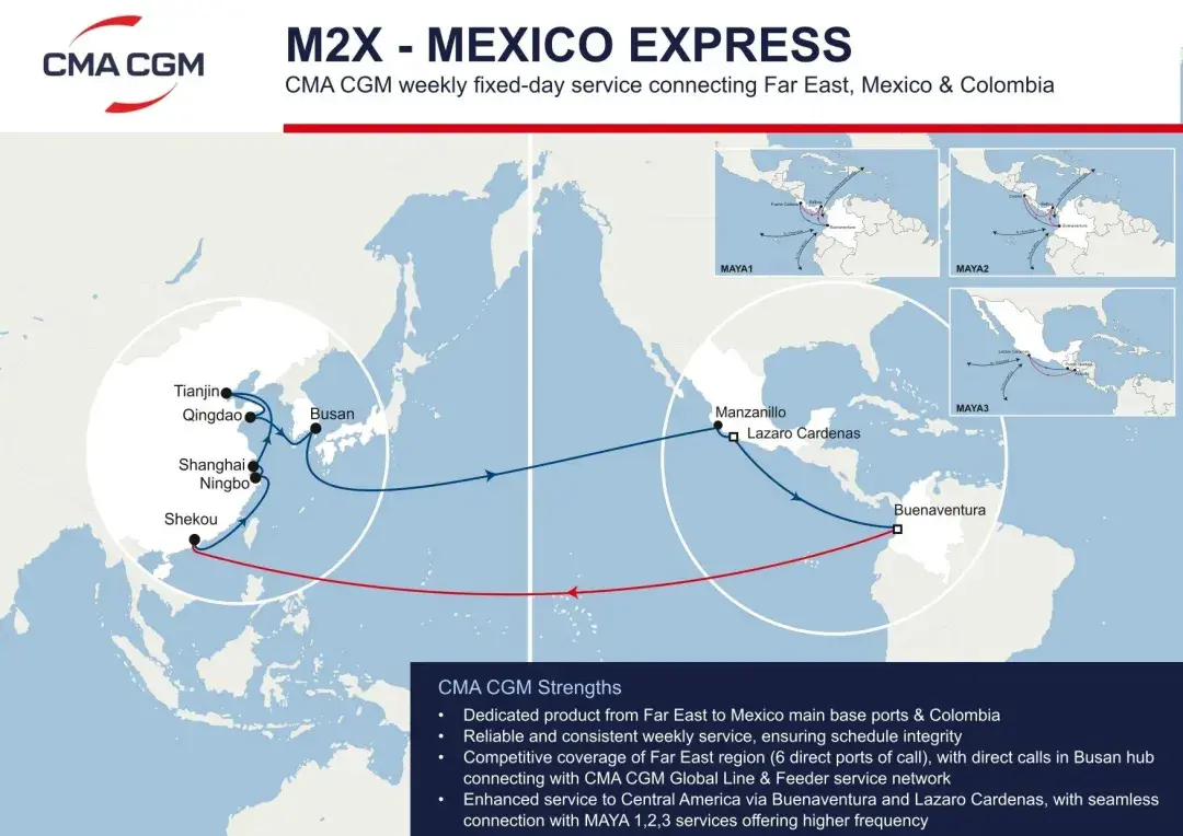 同时,M2X航线将通过在布埃纳文图拉港和拉萨罗卡德纳斯港中转,实现与中美洲西岸航线的衔接,并依托三条新开通的MAYA环线,确保提供通达该地区主要港口的可靠班轮服务。