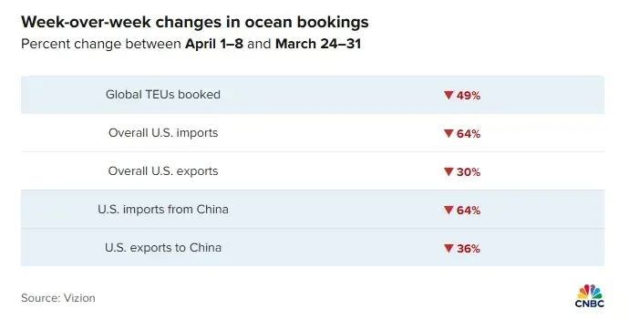 Flexport创始人兼首席执行官Ryan Peterson也表示,自新关税生效以来,从中国到美国的海运集装箱订单在短短三周内暴跌了60%以上。这一大幅下降是在4月9日生效的对等关税之后。
