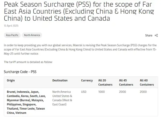 5月15日起,马士基调整远东地区(不包括中国内地和中国香港)至北美的旺季附加费(PSS)。