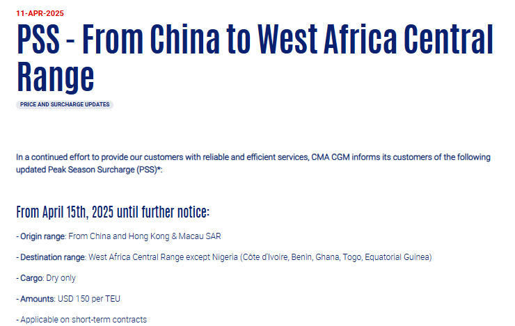 4月15日起,达飞向中国(包括香港和澳门地区)至西非中部(尼日利亚除外)的货物,收取旺季附加费(PSS)。