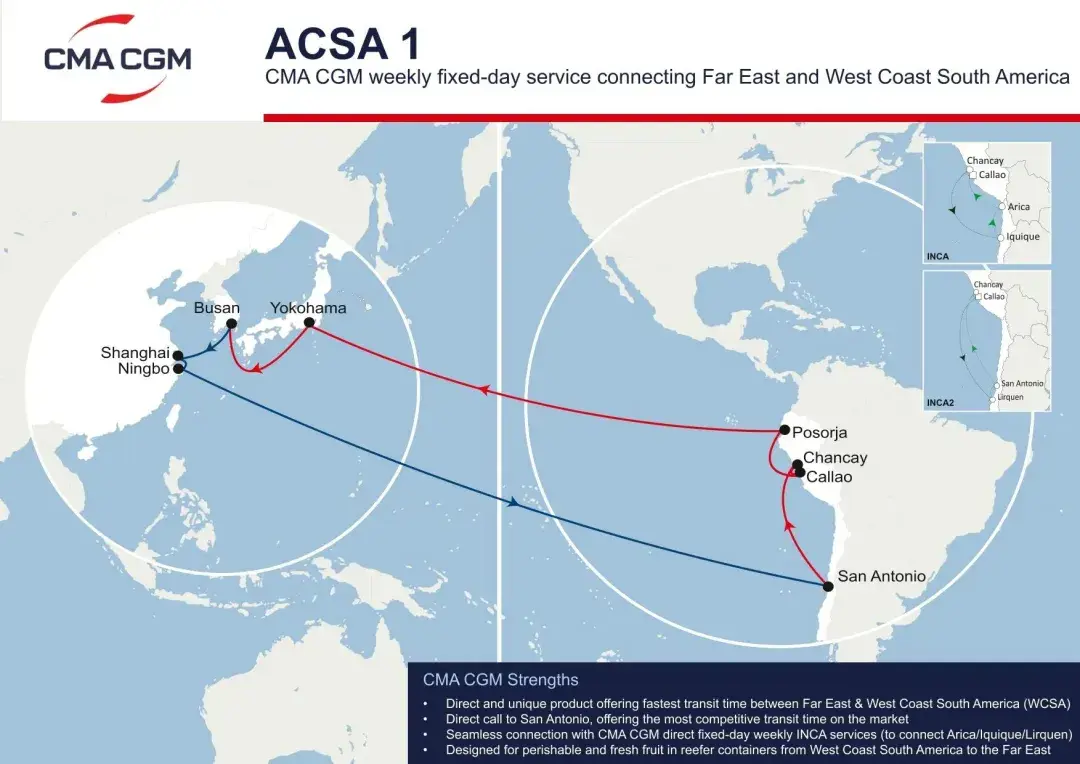 新ACSA1航线挂靠港序为:釜山港(韩国)-上海港(中国)-宁波港(中国)-圣安东尼奥港(智利)-钱凯港(秘鲁)-卡亚俄港(秘鲁)-波索尔哈港(厄瓜多尔)-横滨港(日本)。