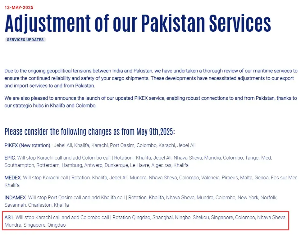 同时推出最新的PIKEX服务,使往返巴基斯坦的连接更加强大。从2025年5月9日起,EPIC、MEDEX、INDAMEX、AS1等多条航线停止卡拉奇挂靠,AS1增加科伦坡挂靠,新路径为:青岛、上海、宁波、蛇口、新加坡、科伦坡、Nhava Sheva、Mundra、新加坡、青岛。详情如下: