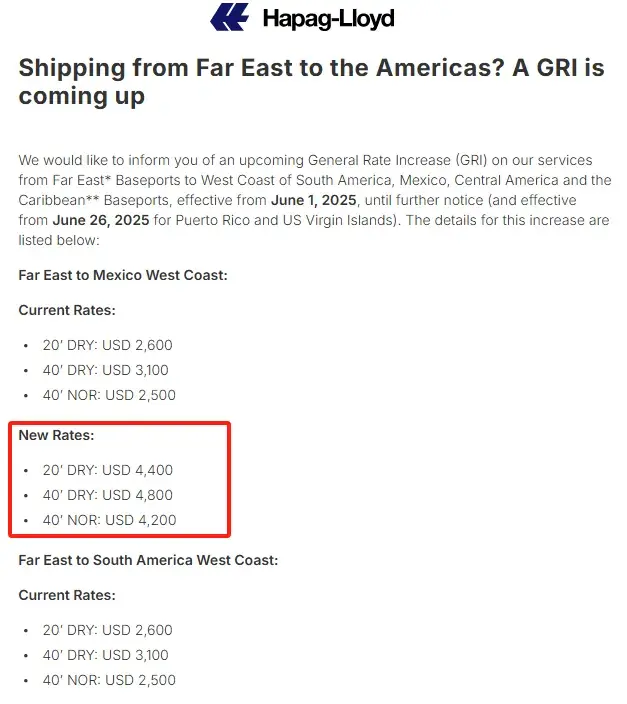 近日赫伯罗特发布公告,自2025年6月1日起,从远东至南美西、墨西哥、中美洲及加勒比海航线GRI生效(波多黎各和美属维尔京群岛6月26日生效),此次调整普遍上调约2000美元。