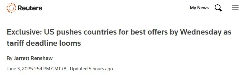 马上到“最后期限”,特朗普“急了”!据路透社6月2日报道,特朗普政府要求各国在周三(6月4日)之前提交最终的贸易协议提议,否则将恢复征收高额关税。