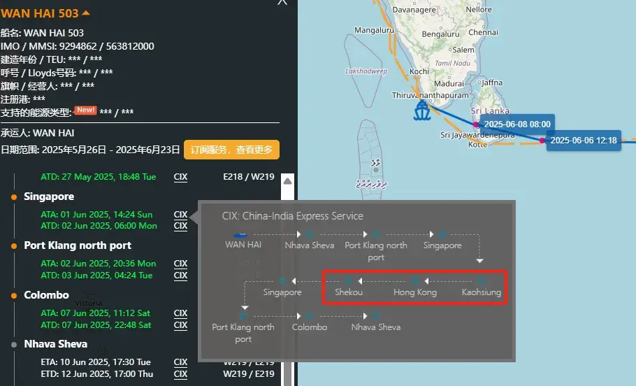 该轮服务于万海的中国至印度的CIX航线,事发时正在执行W219航次任务,涉及HAPAG-LLOYD、EVERGREEN、WAN HAI等船公司共舱,船上满载由高雄、香港、蛇口及新加坡中转的货物,目的港为巴生港、科伦坡和那瓦希瓦。