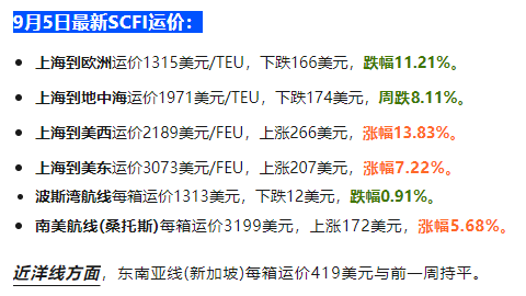 美线在9月首周每40尺柜涨价约750-800美元取得成功,美西运价回升至约2200-2300美元,美东回升至约3200-3300美元。然而,下周订舱价格出现松动,有消息称将下调100-200美元,美西、美东将分别面临2000美元、3000美元的运价保卫战。