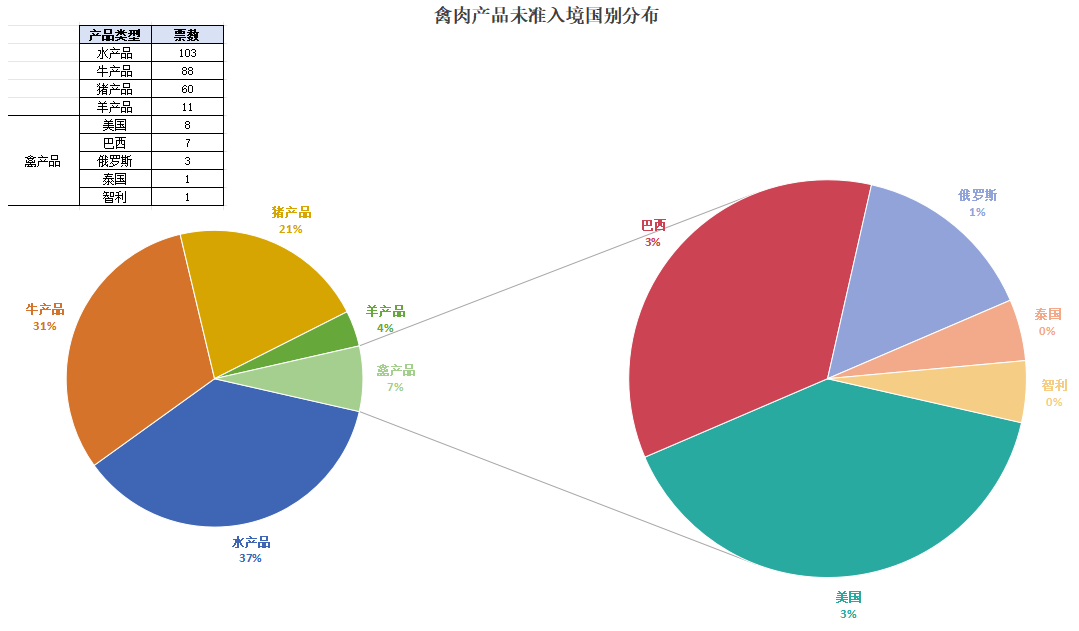 在禽肉产品领域,本次未准入境的国家除去近三个月连续上榜过的巴西、美国、俄罗斯这三个国家外,还增加了泰国和智利。其中美国和巴西的鸡肉产品占据了较大比例,表明这两国在该类产品的生产和出口上具有独特的优势。