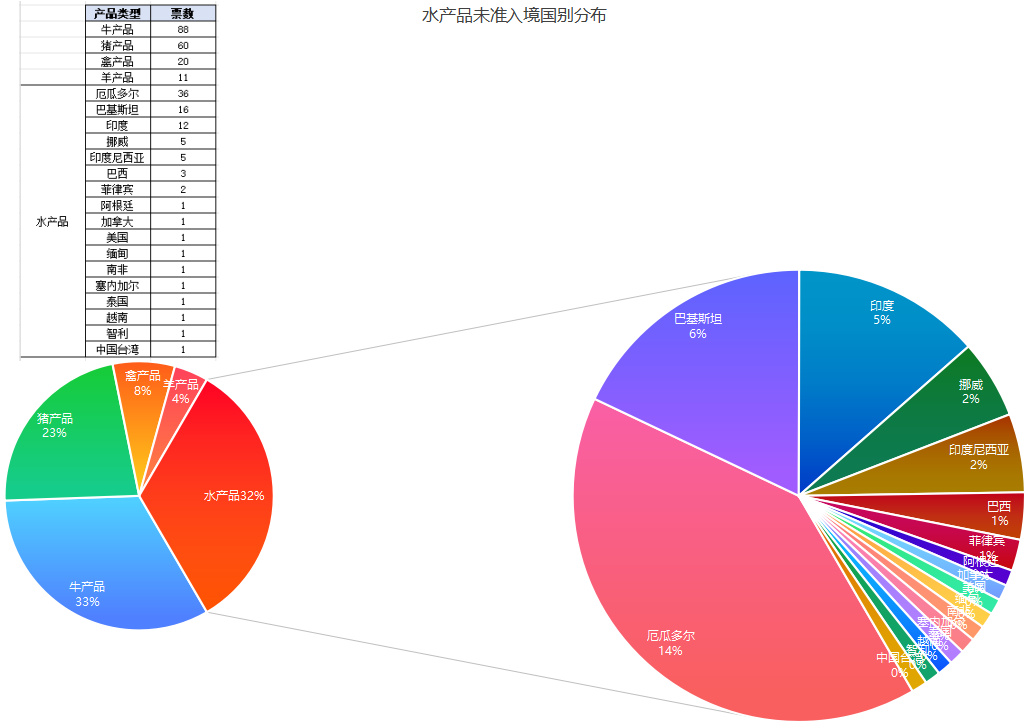 根据产品类型分布图,很明显,本月的占比仍然是水产品排在第一名,这一高比例主要归因于水产品种类繁多且进口规模庞大。尤为引人注目的是,厄瓜多尔白虾检出动物疫病的情况高达26票。